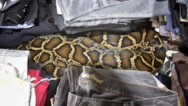 That’s a totally valid question if you were shopping at the flea market at 272 Krome Ave. in Homestead, Florida over the weekend. Miami-Dade Fire Rescue tweeted photos of what turned out to be an 8-foot-long Burmese python hiding out in a pile of jeans for sale. Apparently the snake had recently eaten and crawled into these pants for a post-meal nap.